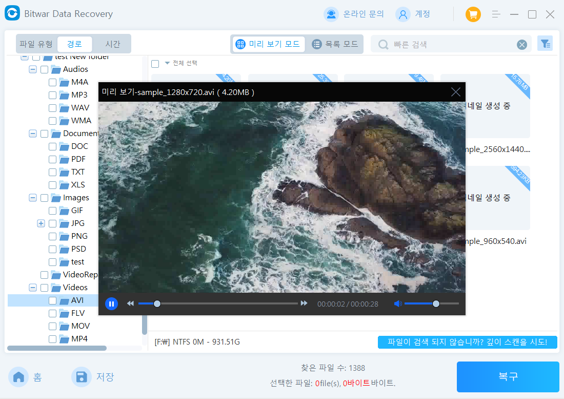 - 스캔 중에 이미 스캔된 파일 정보를 미리 보고, 파일 내용과 품질을 확인한 후 곧바로 스캔을 중지하고 복구할 수 있습니다!