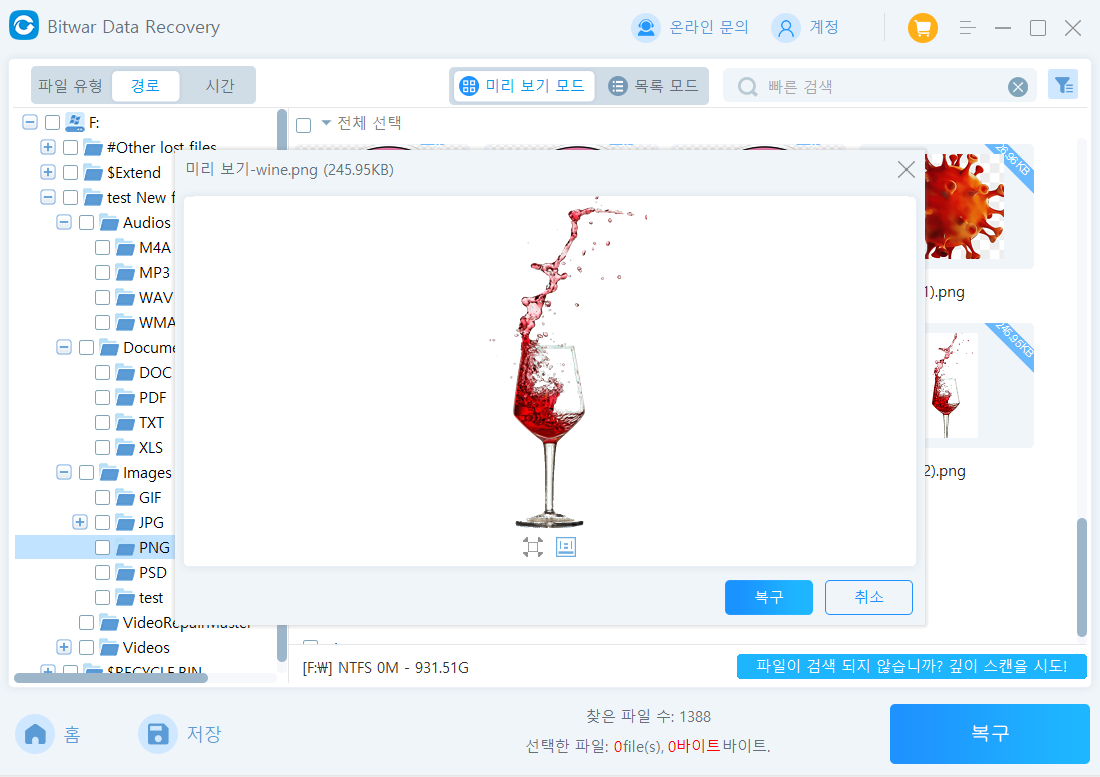 Bitwar Data Recovery 는 삭제된 파일을 찾기 위해 스캔을 시작하고 선택 항목과 일치하는 모든 삭제된 데이터가 나열된다. 미리보기할 파일을 클릭할 수 있다. 미리 보기 후 대상 파일을 선택하고 "복구"를 클릭하여 장치의 다른 안전한 위치로 되돌릴 수 있다.