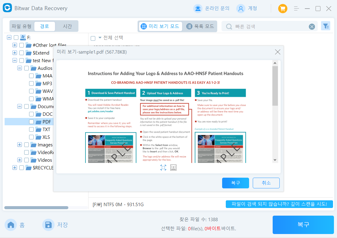 단계 3: 데이터 복구 소프트웨어는 모든 데이터를 하나씩 나열하며, 복구할 데이터를 복구, 경로, 데이터 이름 등으로 찾아서 미리 볼 수 있습니다. Bitwar 데이터 복구 소프트웨어는 다양한 일반적인 복구 데이터를 미리 볼 수 있습니다. 그런 다음 복구할 데이터를 선택하고 “복구” 버튼을 클릭하여 안전한 위치나 파티션에 저장합니다.